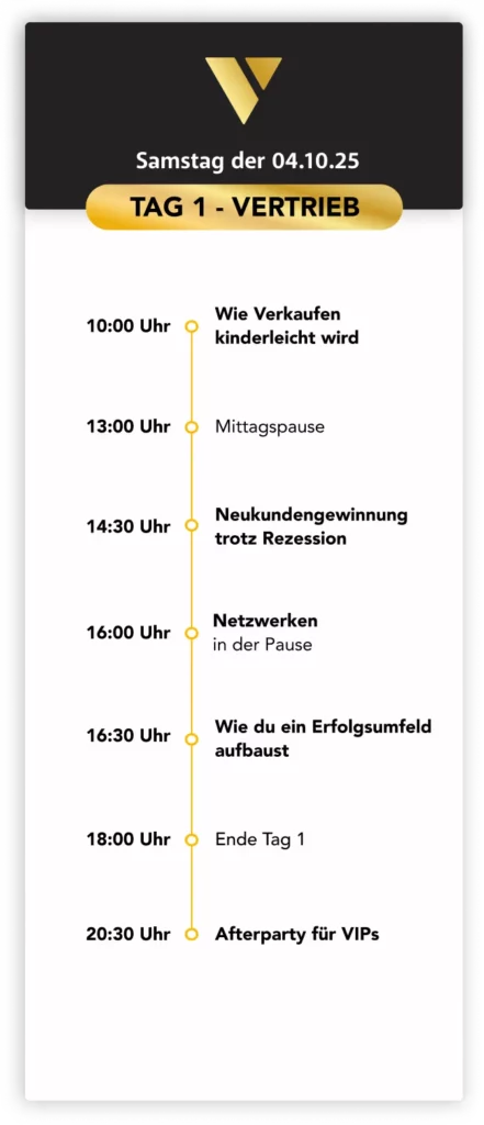 Die Interesse an deinem Angebot haben. Und wie du sie charmant abschließt, lernst du live auf dem Event. Nutze deine Chance. Sei Teil der Elite und profitiere von zwei Tagen Netzwerken, innovativen KI-Prozessen und maximaler Motivation.