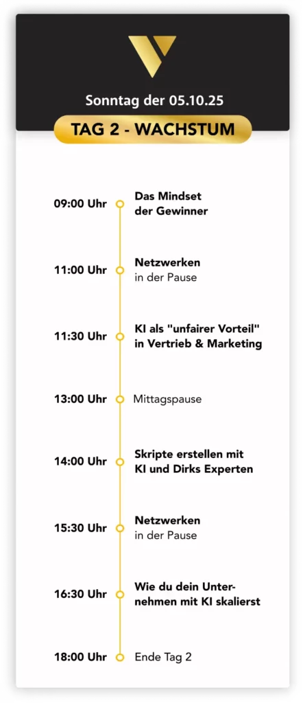 Gemeinsam mit Dirk erarbeitest du live vor Ort sofort anwendbare Vertriebswerkzeuge mit KI für effizienteste Skalierung deiner Kundengewinnung. Plus: Dirk stellt für dich erstmalig auf einem Event aktiv Kontakt zu interessierten Neukunden, Geschäftspartnern und Mitarbeitern her.